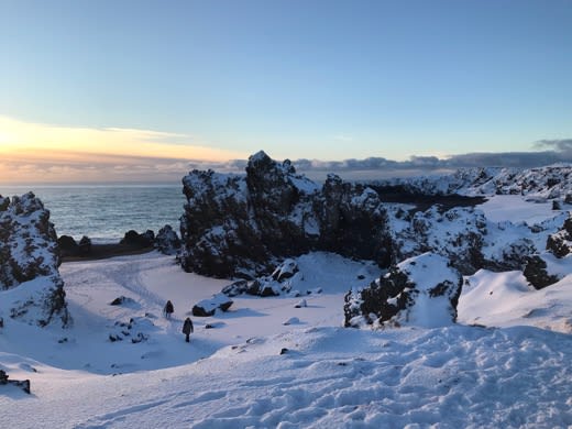 The first leg takes us to the idyllic fishing-village of Arnarstapi where we walk along the coastal cliffs exploring basalt columns and blow holes created by the powerful surf.